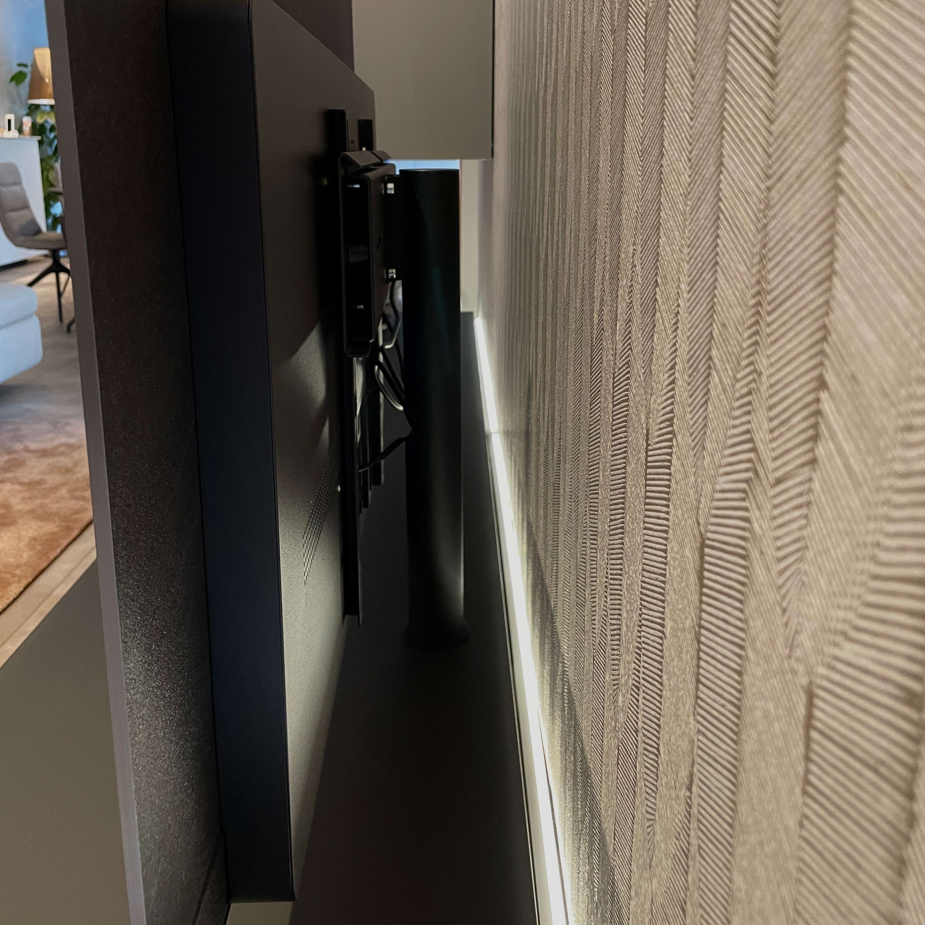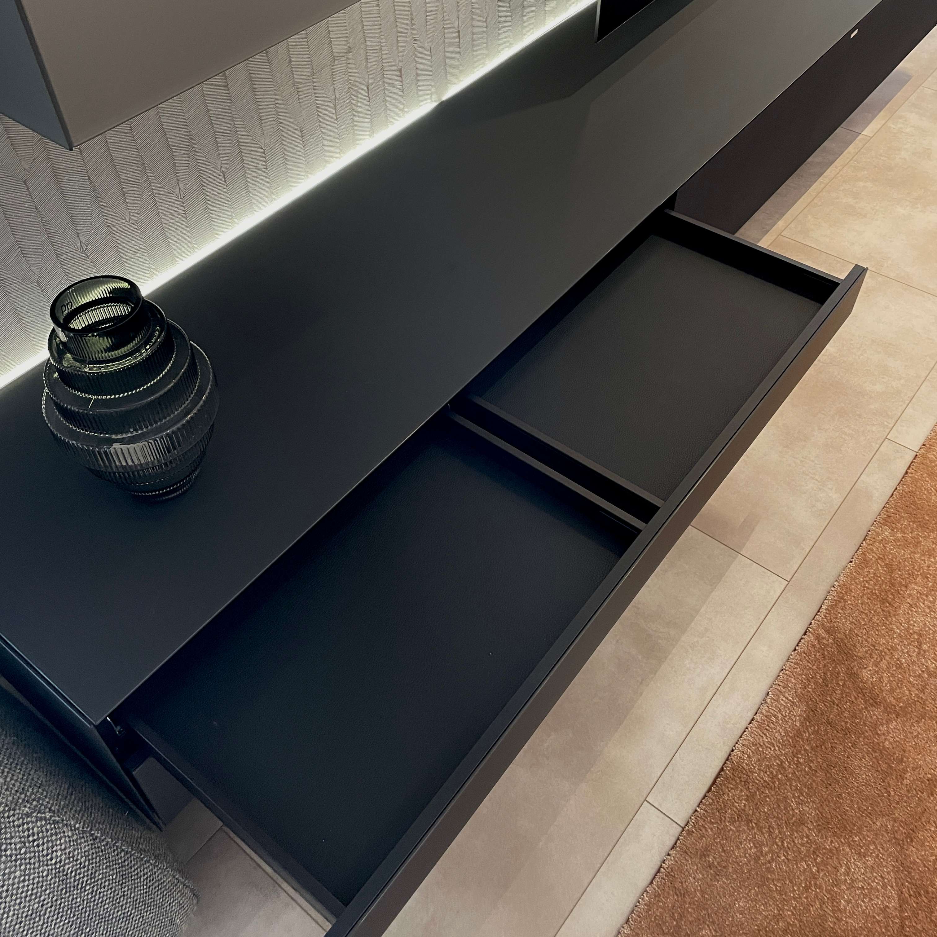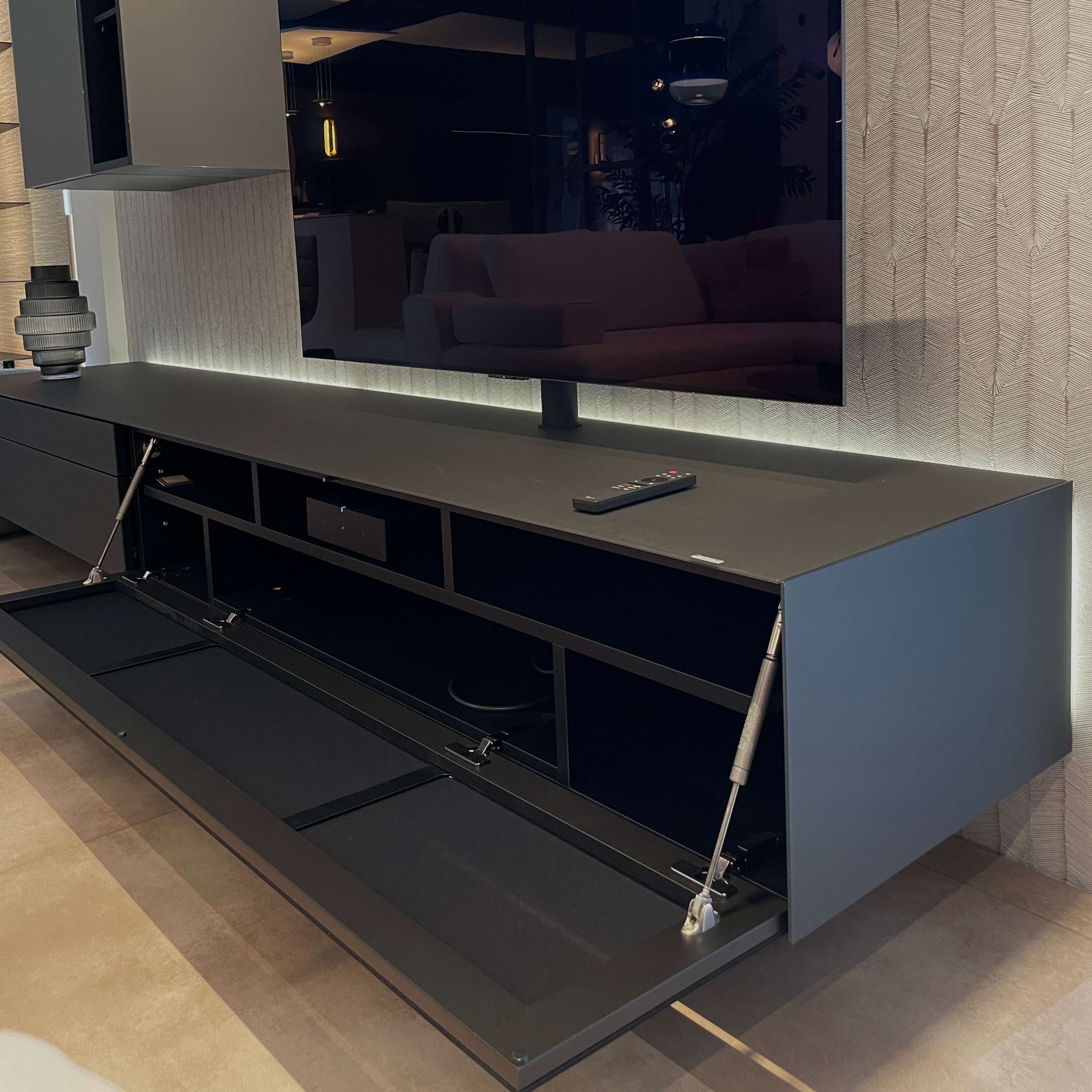 Dit luxe Spectral tv-meubel is uitgevoerd in mat zwart glas met een zwart akoestisch frontdoek. De bovenkast is afgewerkt in metallic glas Iron met stijlvolle zwarte accenten, wat zorgt voor een modern en tijdloos geheel.