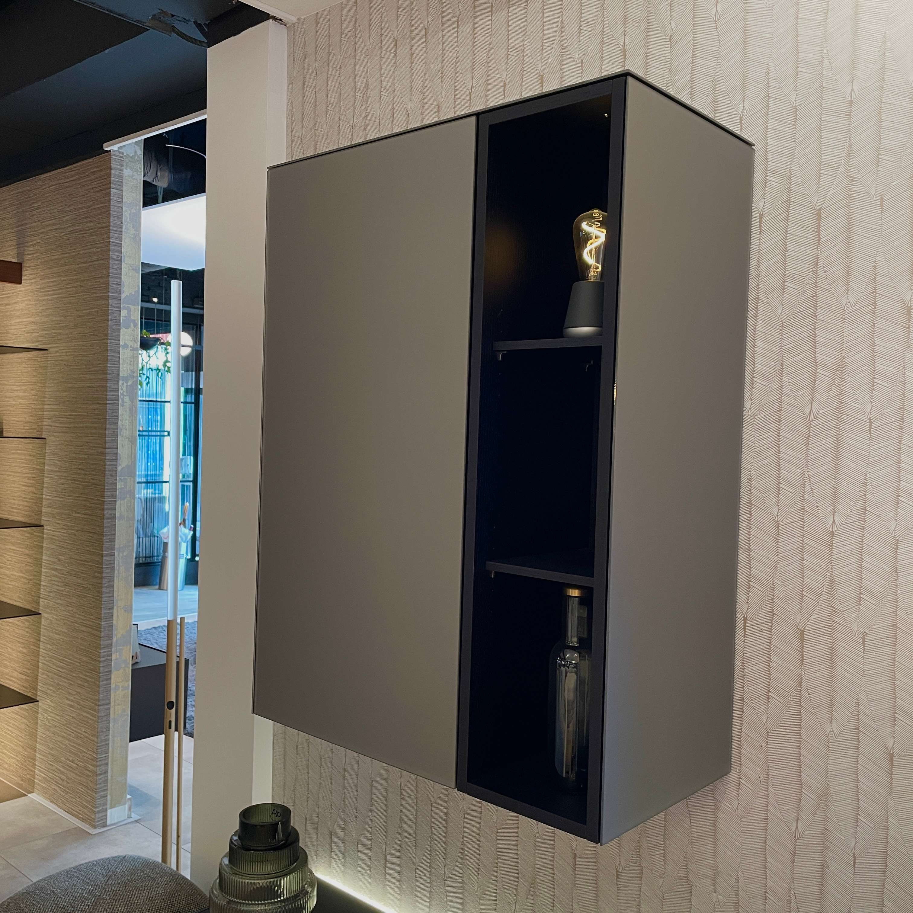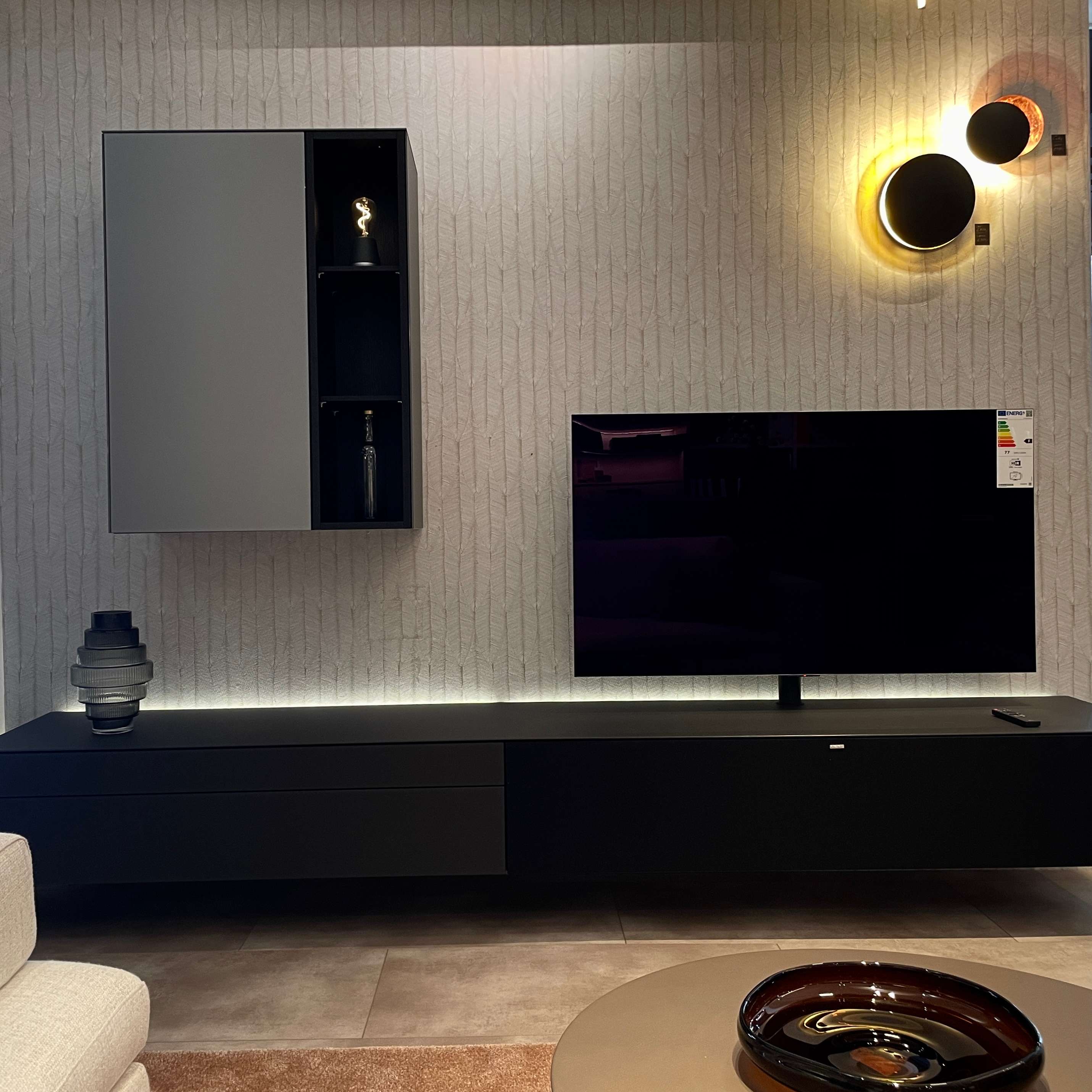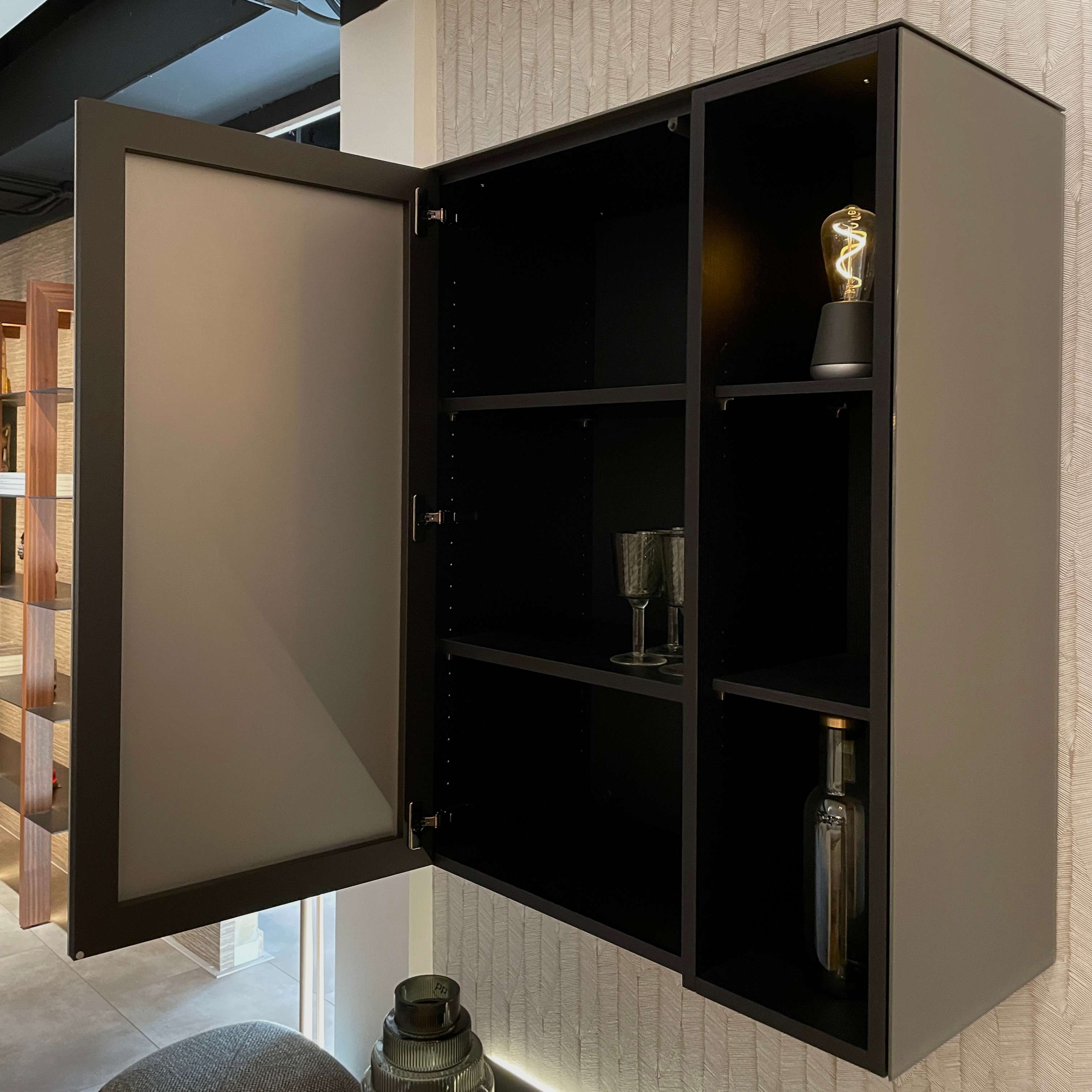 Dit luxe Spectral tv-meubel is uitgevoerd in mat zwart glas met een zwart akoestisch frontdoek. De bovenkast is afgewerkt in metallic glas Iron met stijlvolle zwarte accenten, wat zorgt voor een modern en tijdloos geheel.