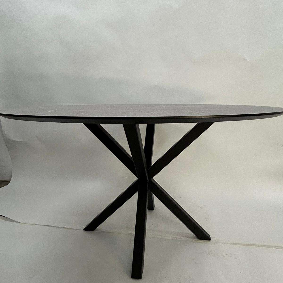 Een mooie, moderne eettafel in matzwart met een blank houten rand als leuk detail.