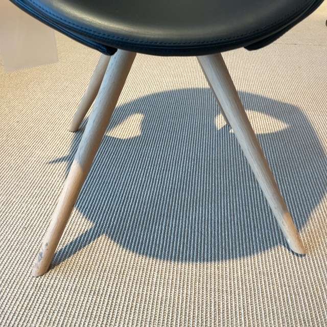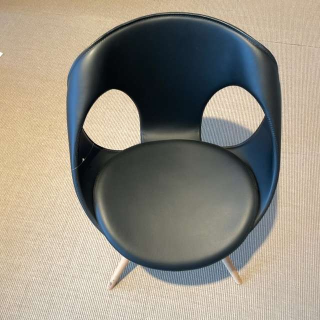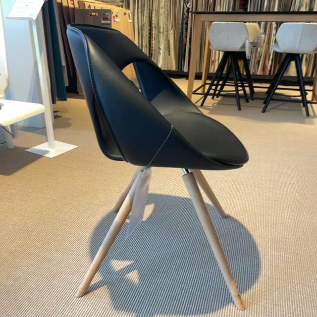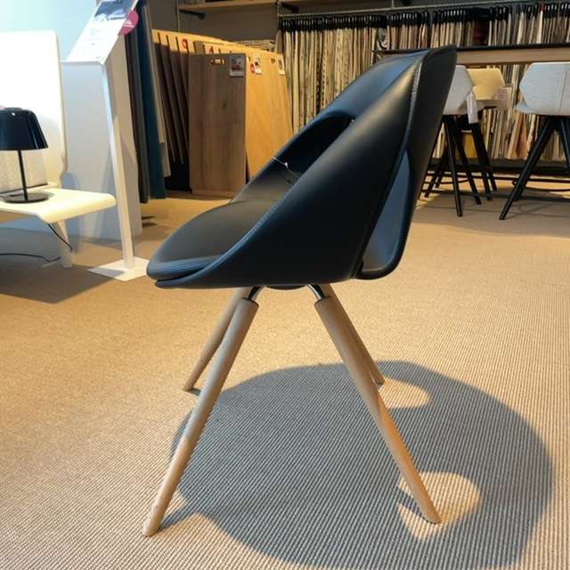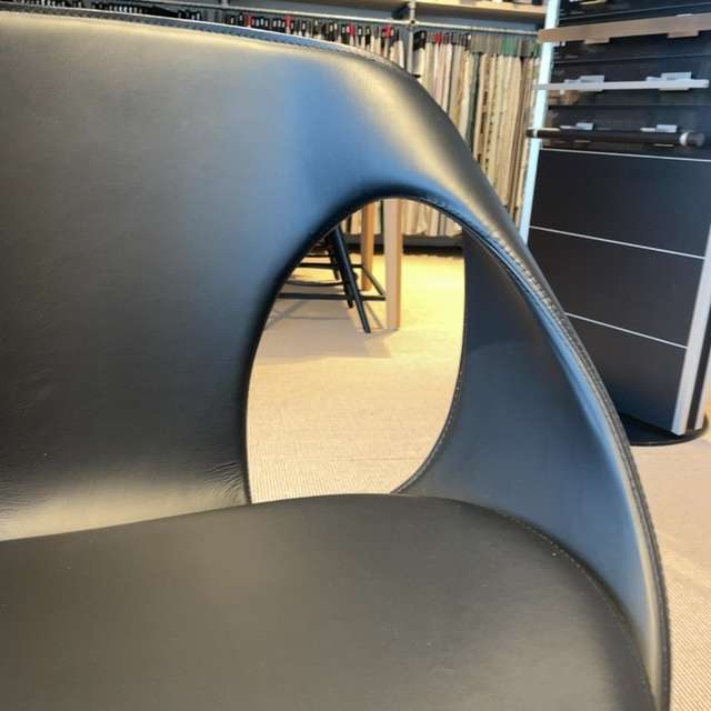 Fijne stoel van Tonon. Stoel is uitgevoerd met armleuningen, kuip is in leer Tender 220 zwart, Poten in eiken naturel 3-102, met viltgelijders.