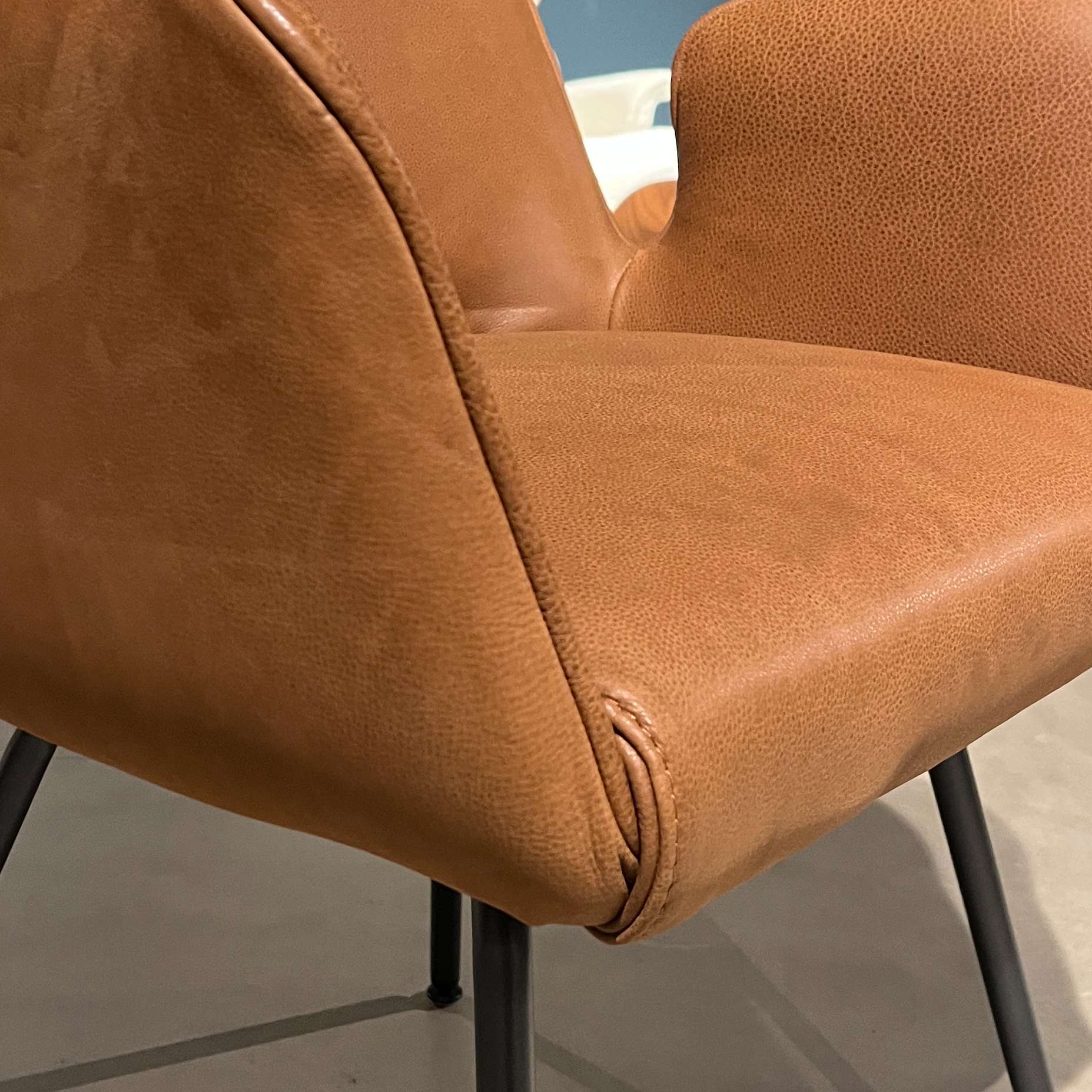 Eetkamerfauteuil Saba van Topform kenmerkt zich door een strakke, kubistische belijning en een modern vormgegeven poot. De stoelen zijn bekleed met Montana leder in de kleur caramel. Dit ledertype blijft dicht bij de oorspronkelijke rundhuid en heeft slechts een minimale afdekking, waardoor natuurlijke kenmerken zoals tiks, krassen, littekens, insectenbeten, groeistrepen, huidplooien, aders en brandmerken zichtbaar blijven. Deze eigenschappen geven het leer een levendig en uniek karakter.
