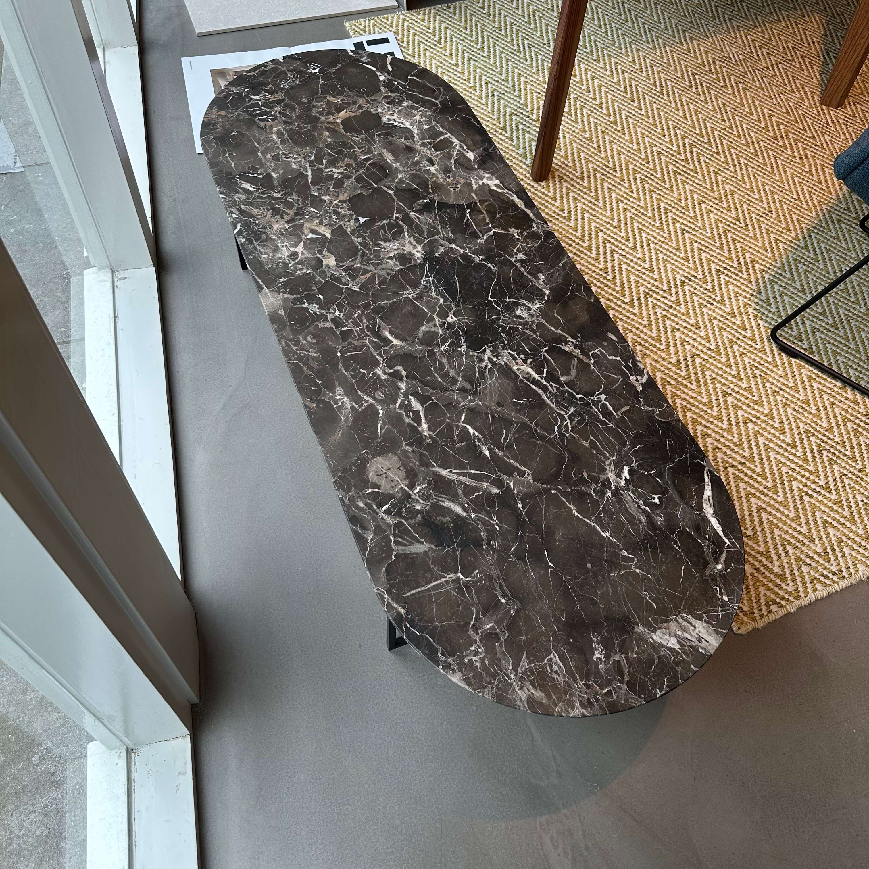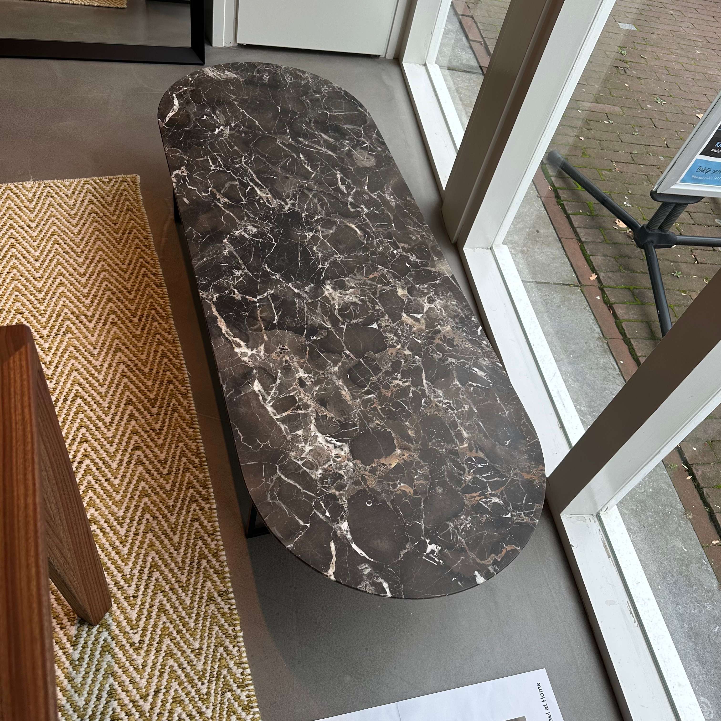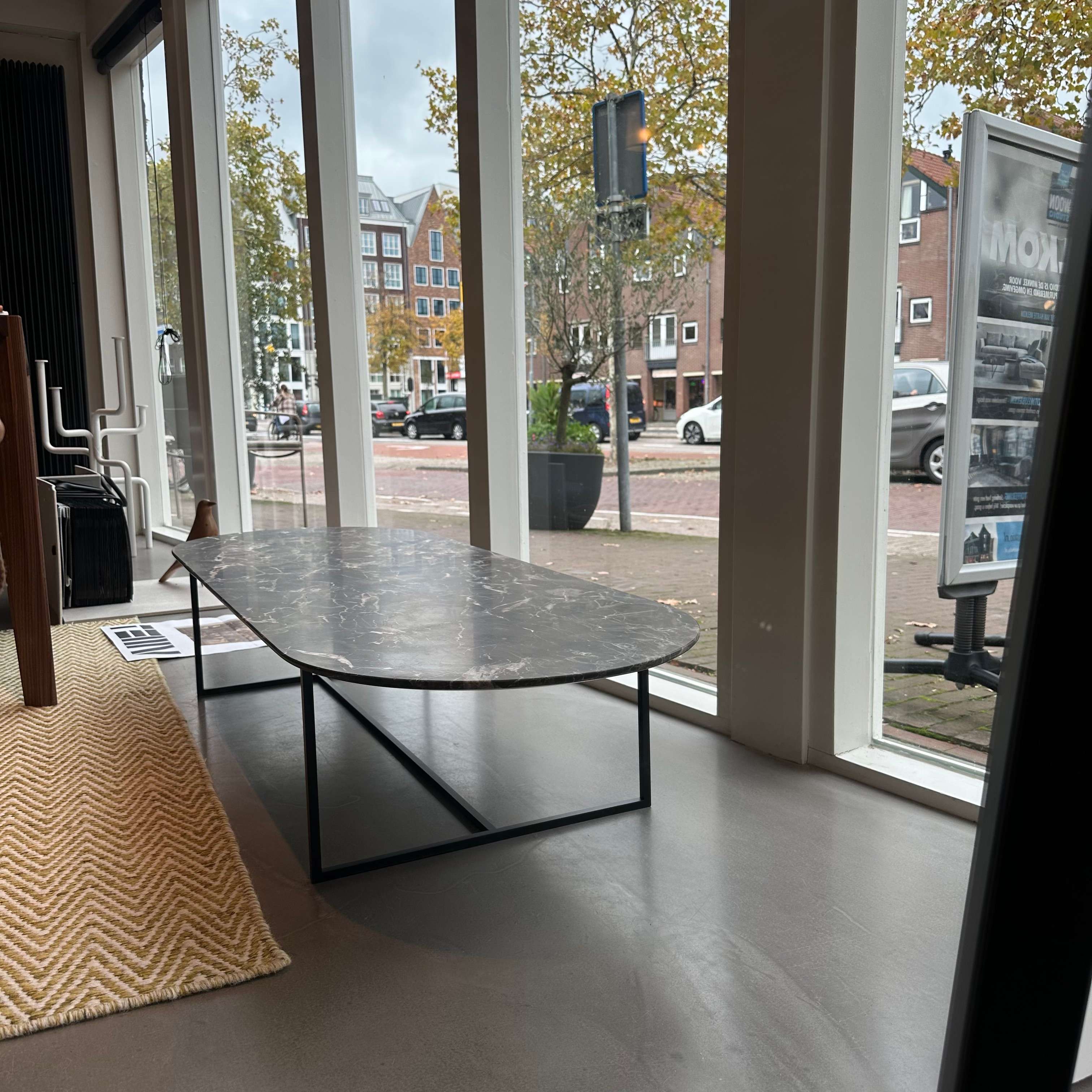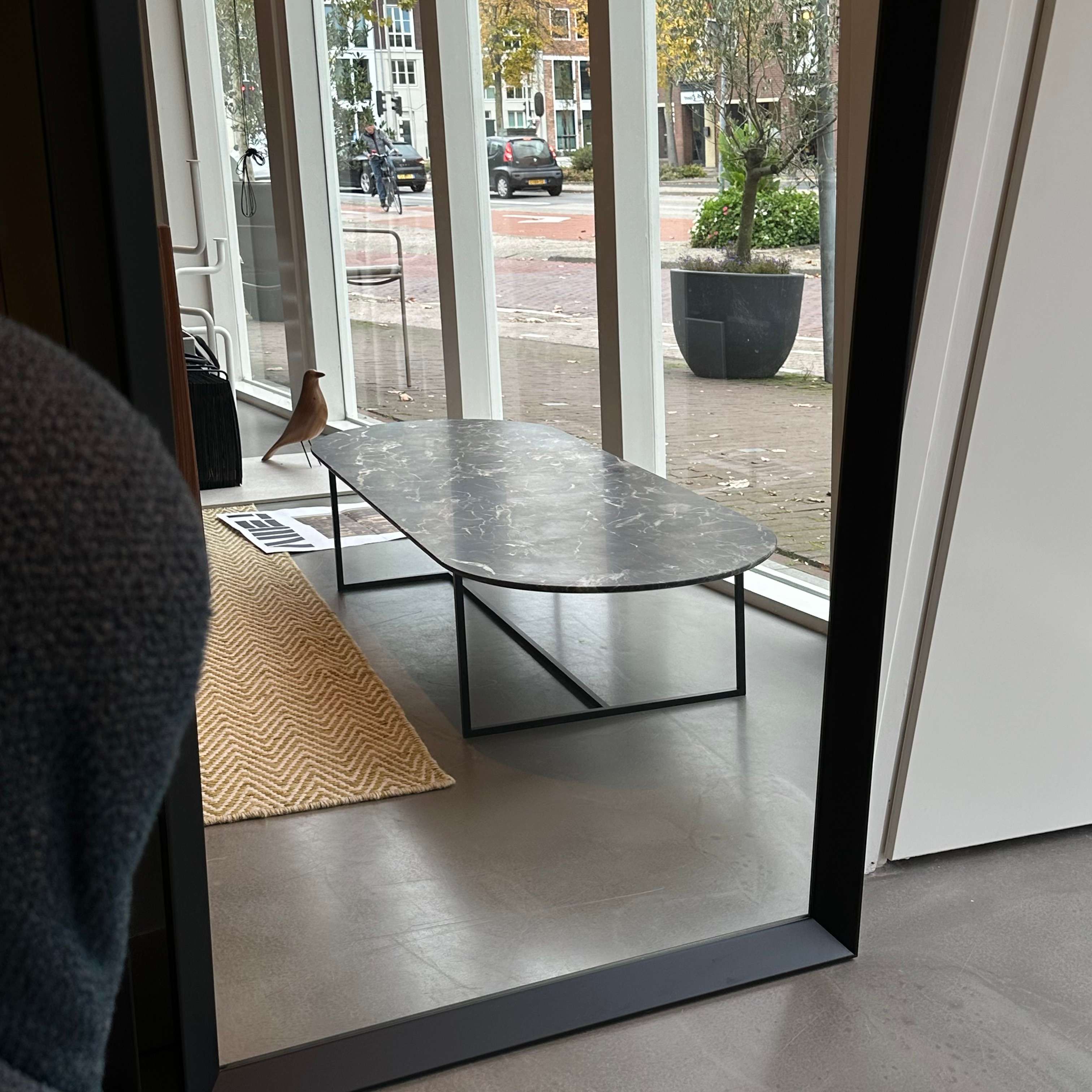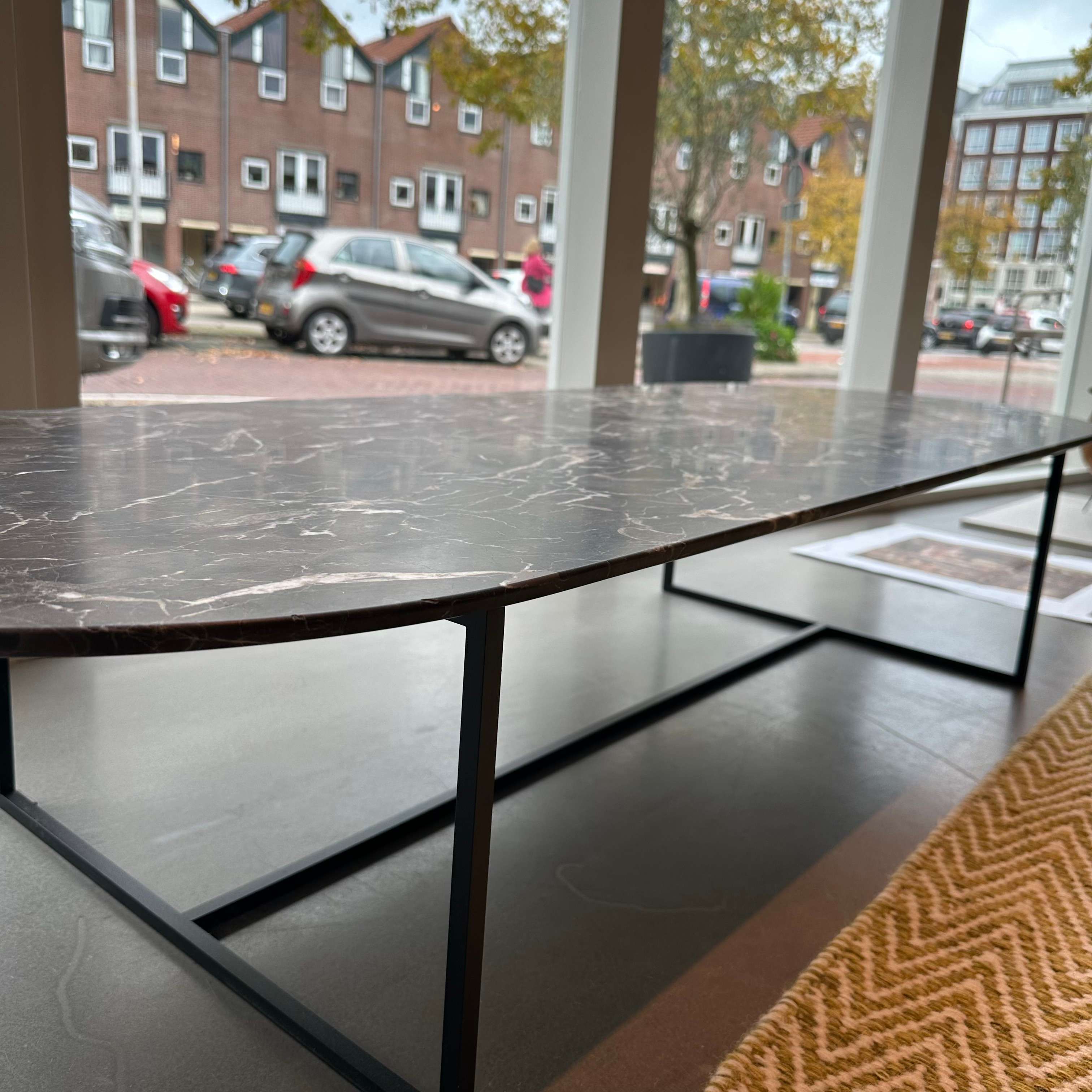 Wat deze salontafel zo bijzonder maakt, is het zorgvuldig gekozen marmeren blad. Elke tafel is uniek, met zijn eigen natuurlijke tekening en kleurnuances die het marmer karakter geven. De slanke metalen poten geven de tafel een lichte, bijna zwevende uitstraling, terwijl de constructie stevig en duurzaam blijft. Dit is precies wat je mag verwachten van een hoogwaardige salontafel zoals deze.