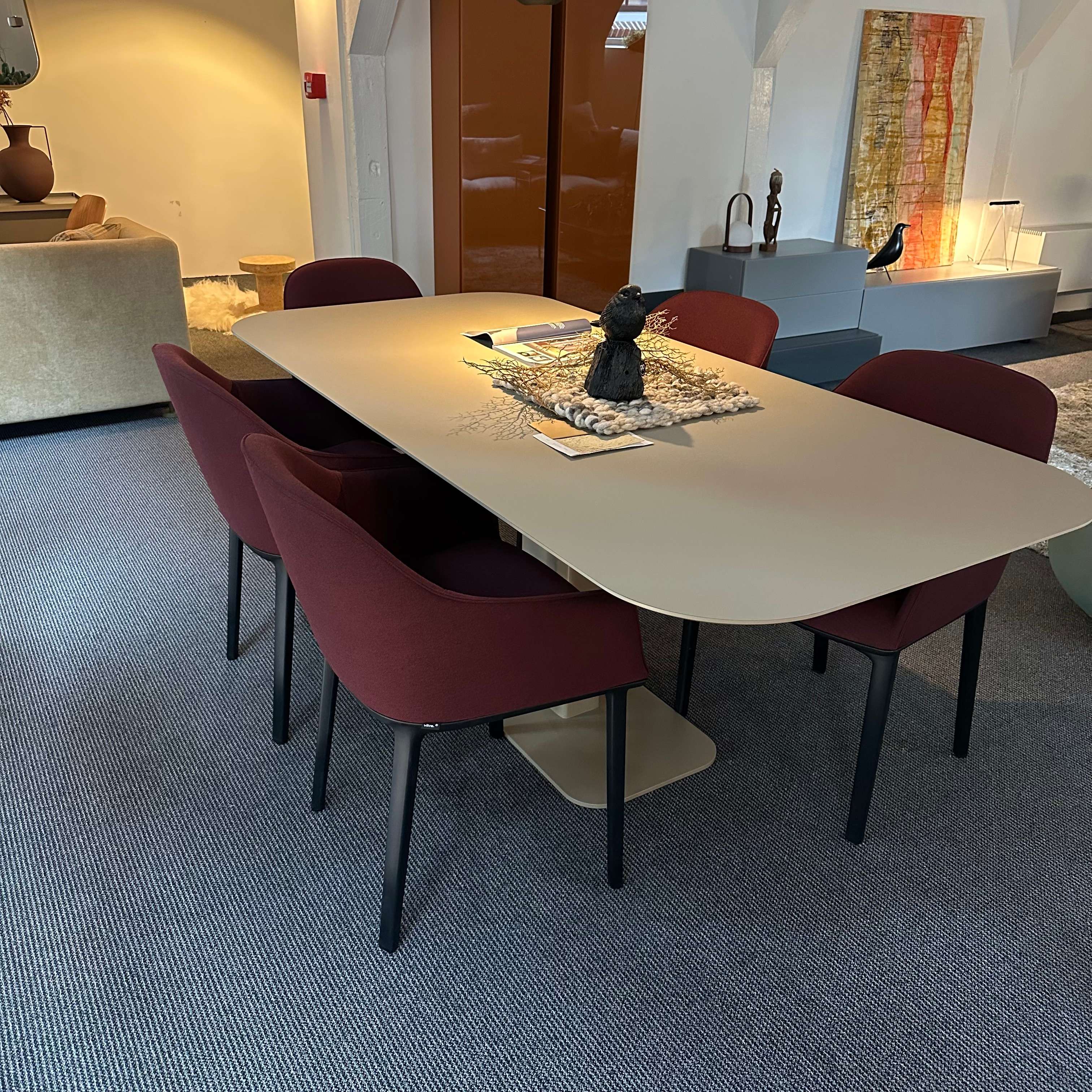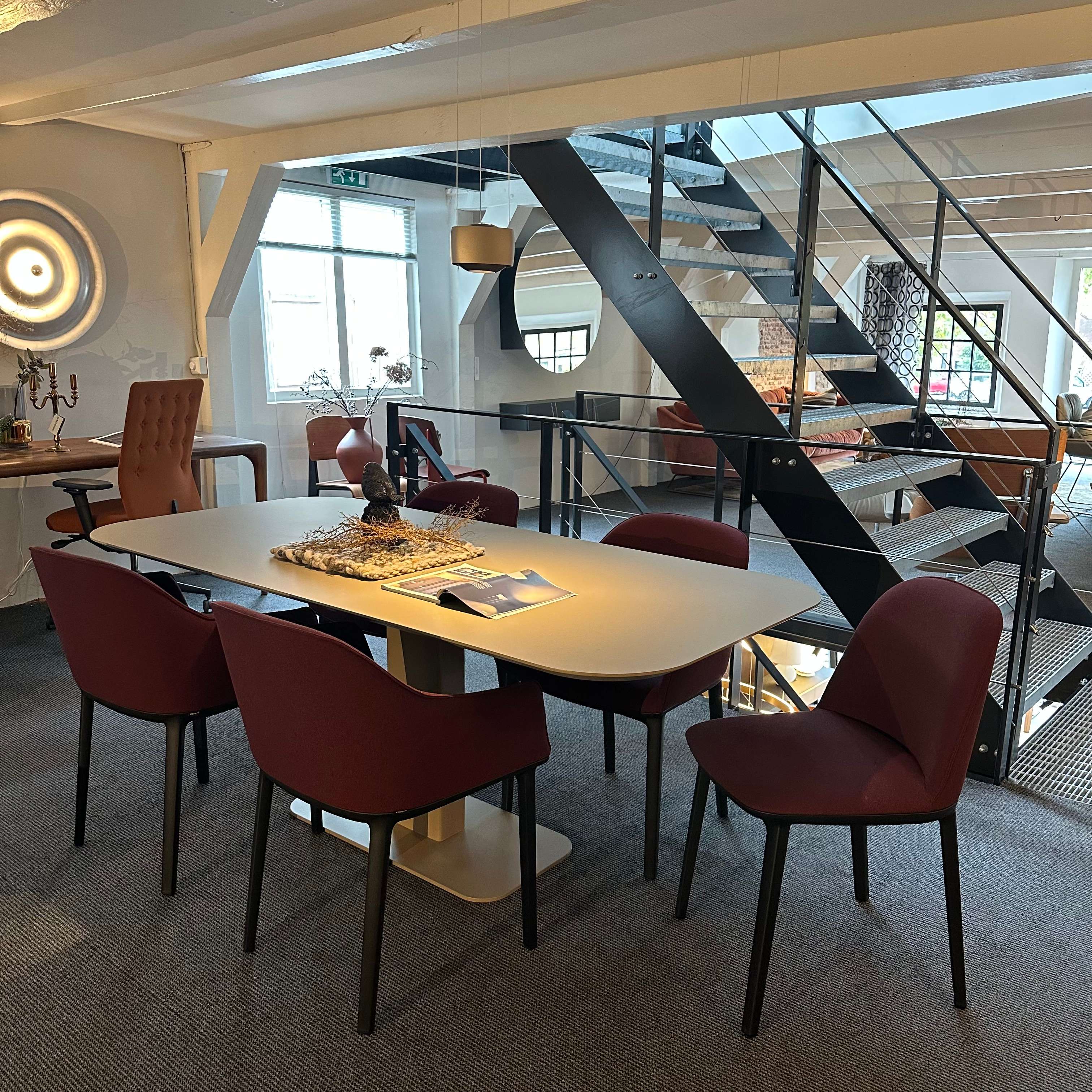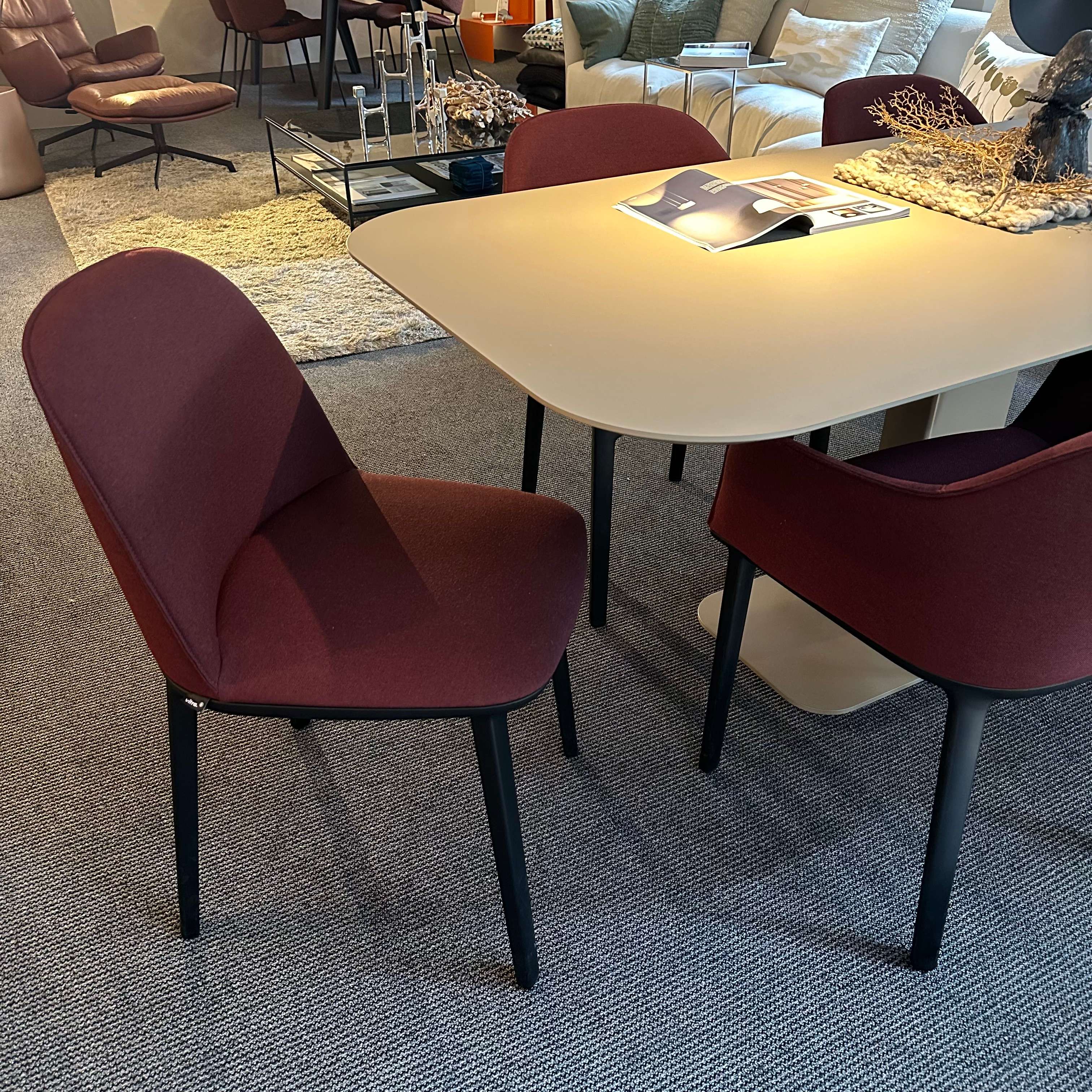 Ontdek de tijdloze elegantie van de Vitra softshell stoelen in de kleur nero dark red. Deze set bestaat uit 4x softshell chairs met armleuningen en 1x softshell side chair zonder armleuning. Samen vormen ze een stijlvolle en comfortabele aanvulling op iedere eetkamer.