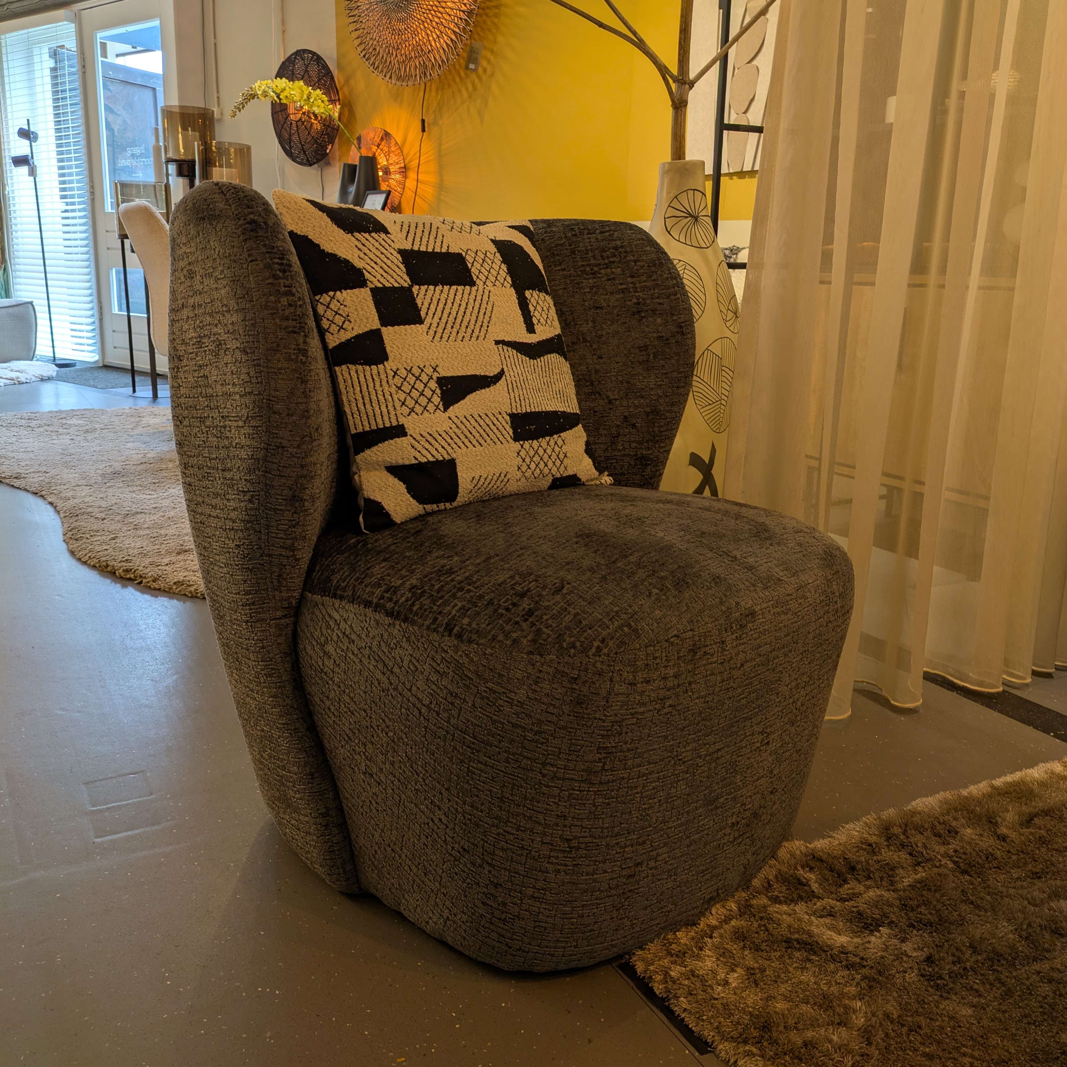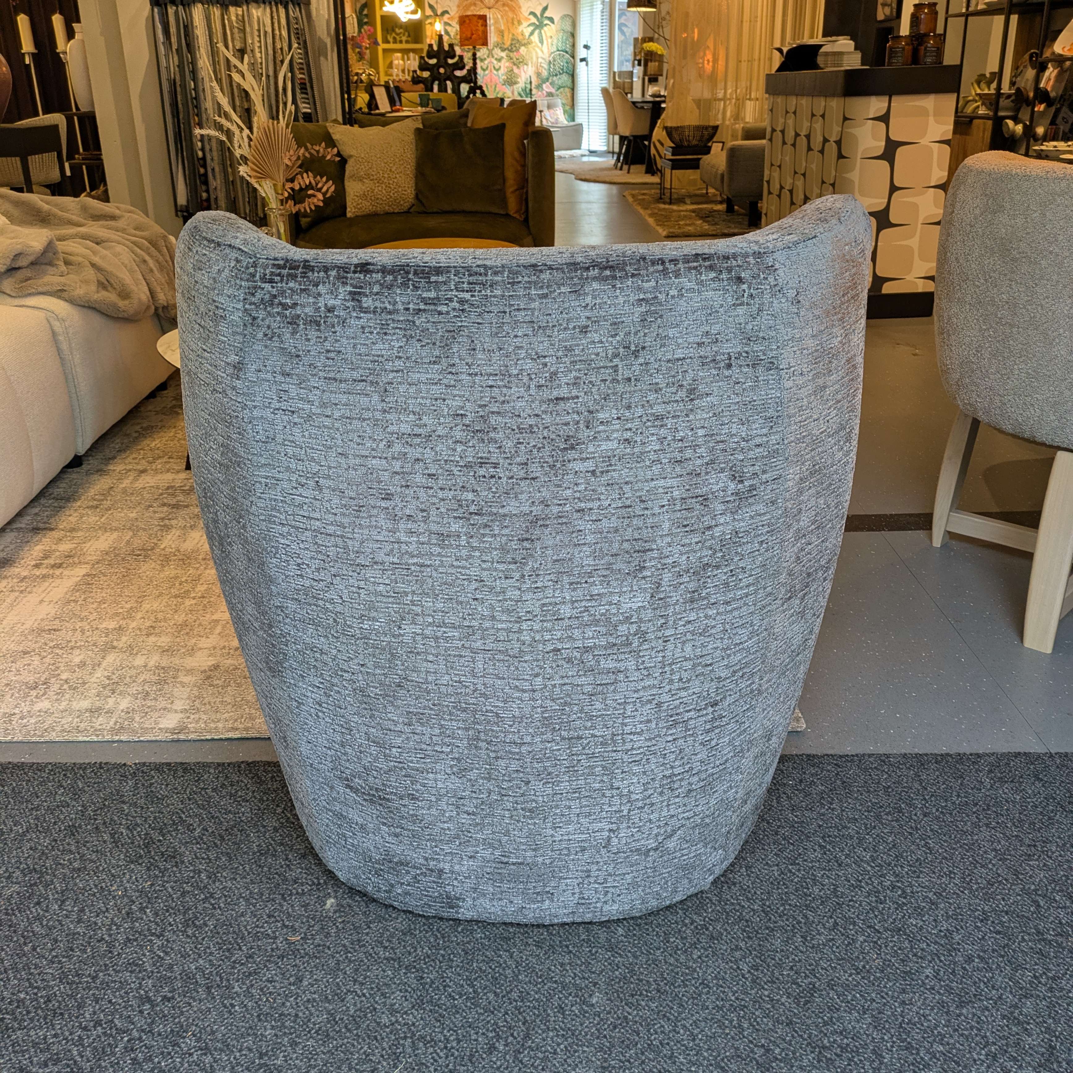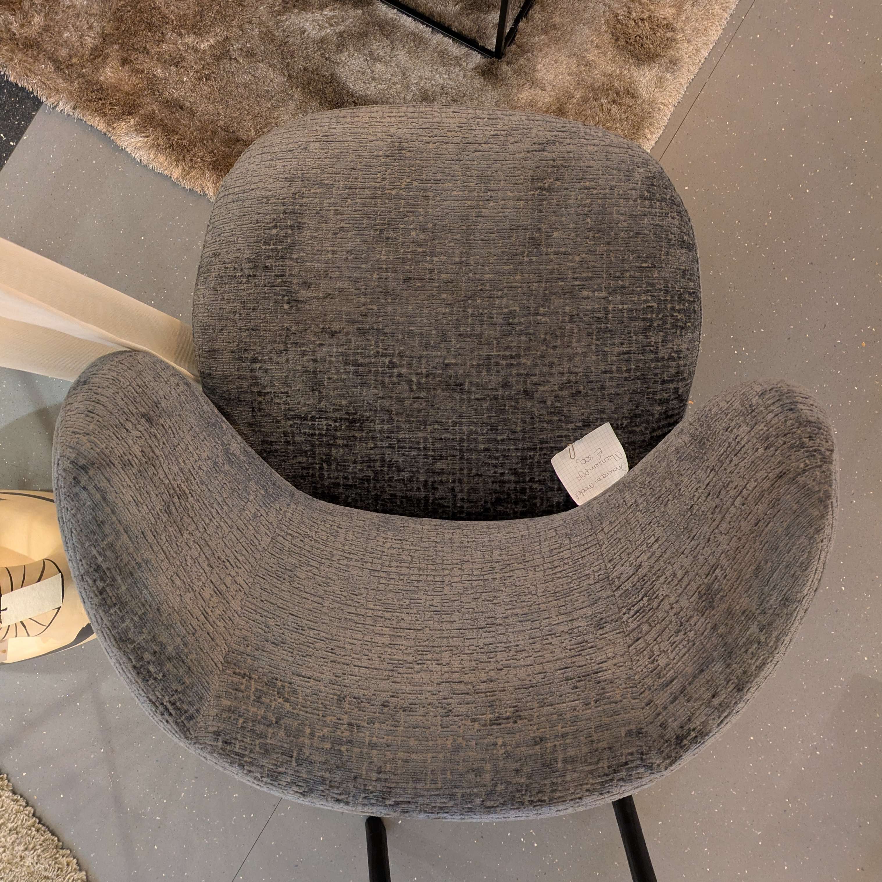 Leuke compacte, ronde fauteuil. Deze stoel heeft 6 maanden in de showroom gestaan maar moet nu plaatsmaken voor een nieuw model en daarom mag ze voor een klein prijsje weg. De fauteuil is nog in nieuw staat, geen gebreken of slijtage. Gestoffeerd in de sterke meubelstof Fusion kleur 67 antraciet. Maten: 80 hoog, 75 breed, 82 cm diep, zithoogte 45 zitdiepte 58.