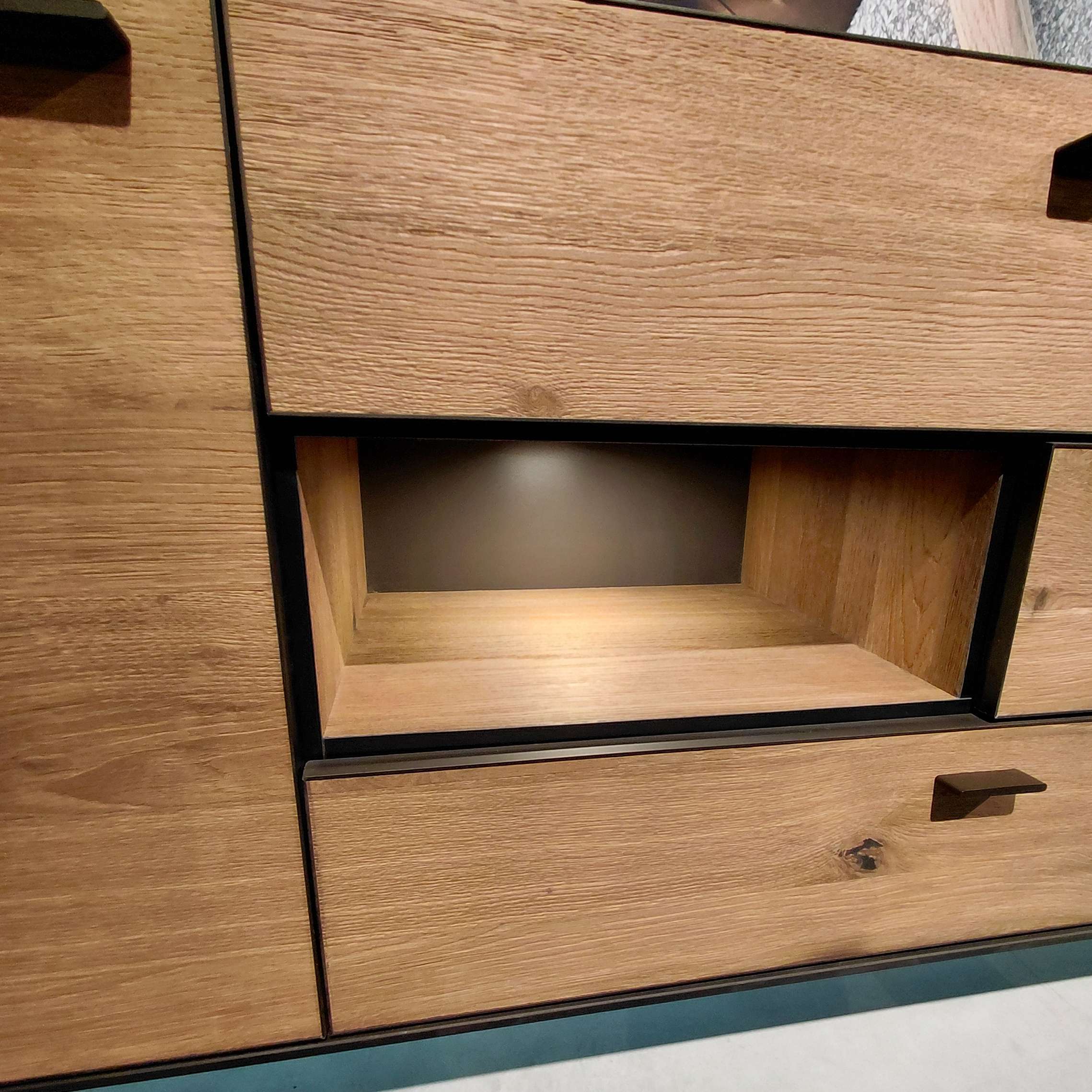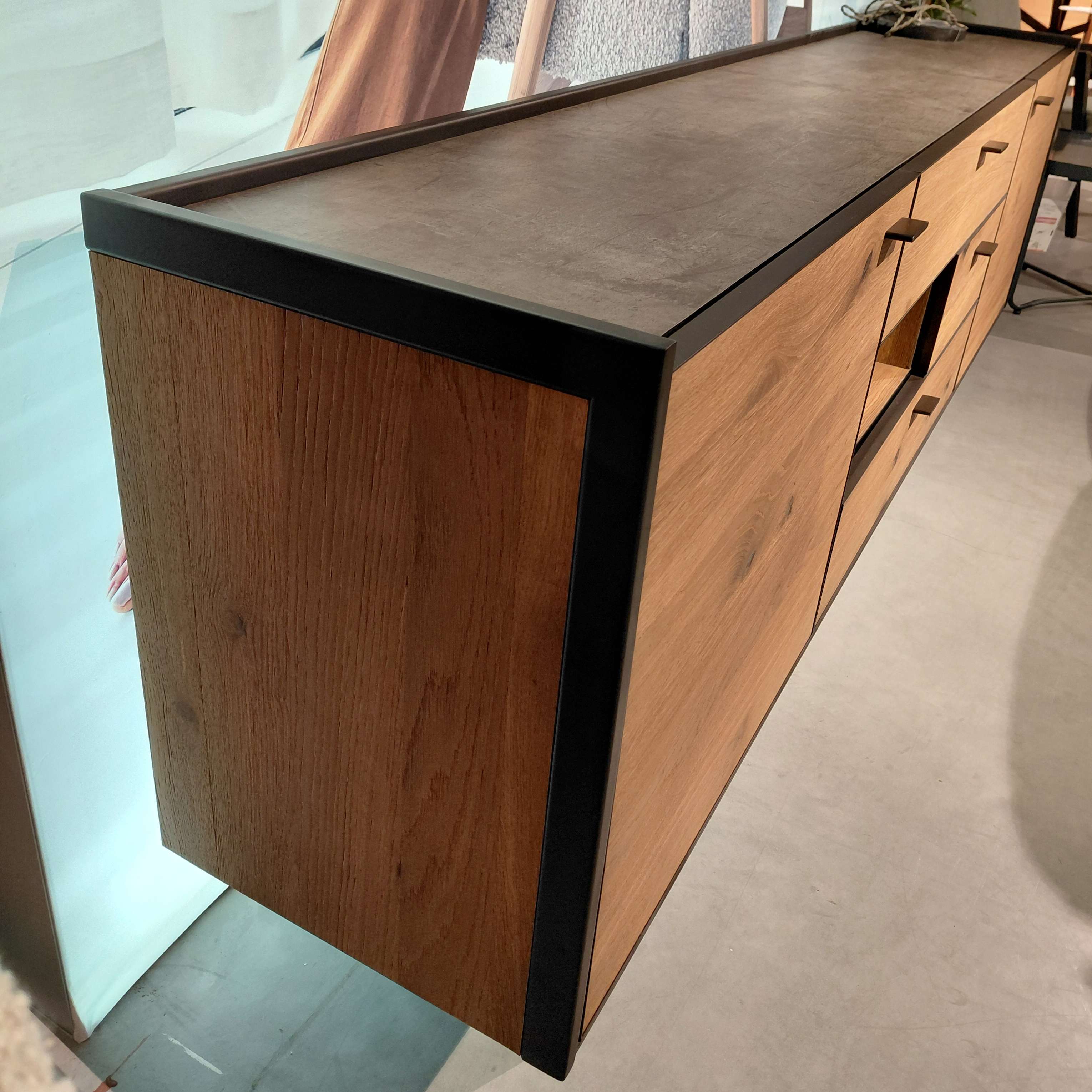 Dit dressoir is uitgevoerd in donker eiken met metalen frames en lijsten. De top is uitgevoerd in sterk, onderhoudsvriendelijk Primo Laminato (HPL) met een industriële betonlook. Ranke, metalen poten geven de stoere kast zijn unieke, elegante look. Deuren en lades zijn uitgerust met een soft-close systeem.