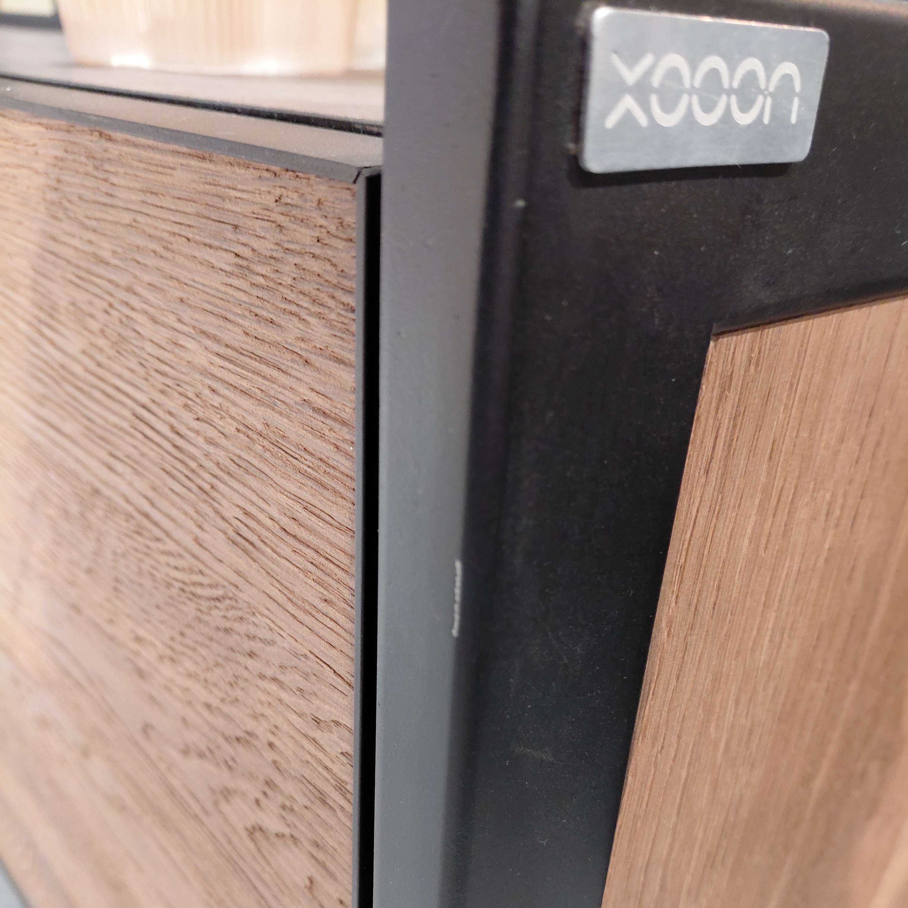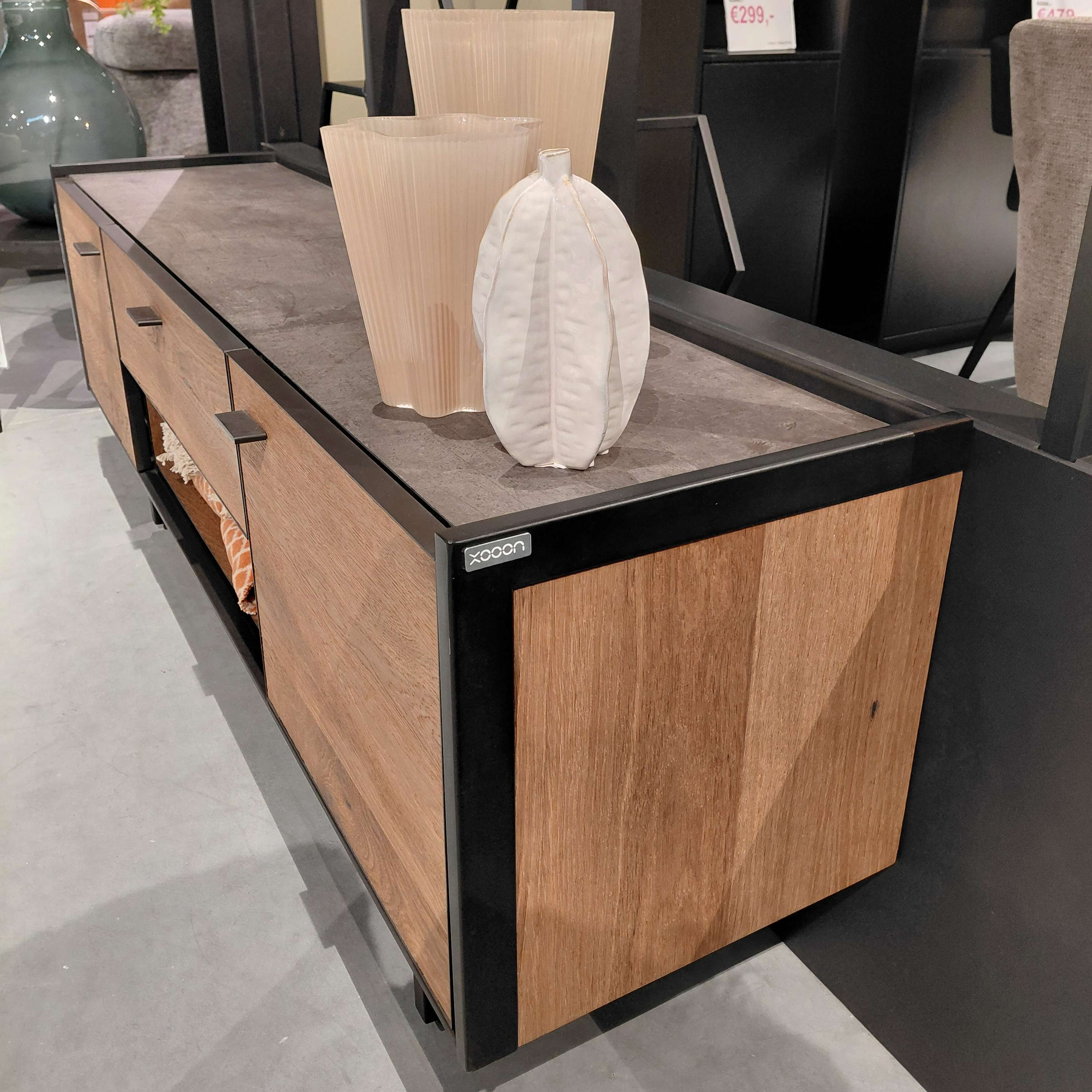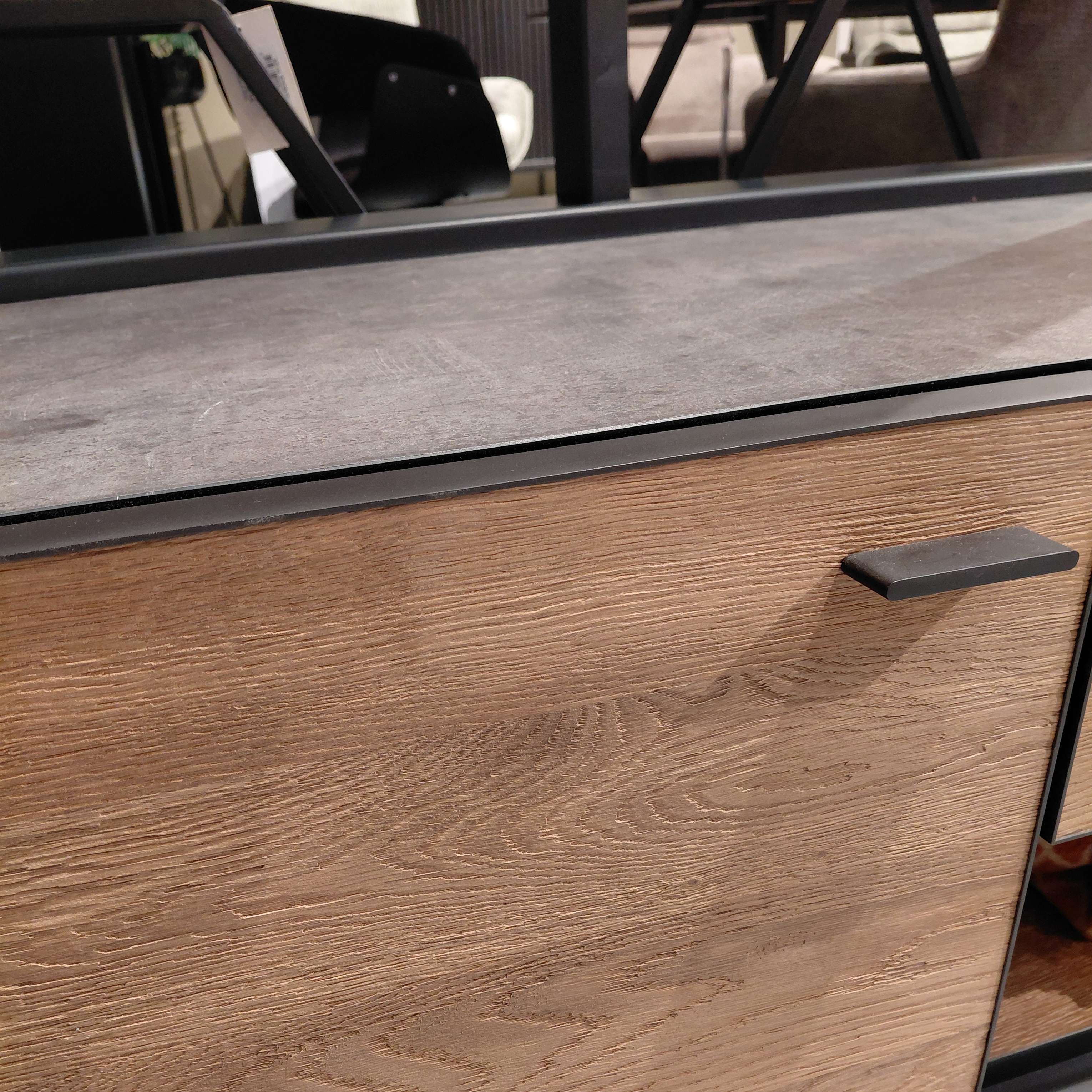 Bij dit Fresno lowboard is donker eiken gecombineerd met metalen frames en lijsten. De top is uitgevoerd in sterk, onderhoudsvriendelijk Primo Laminato (HPL) met een industriële betonlook. Ranke, metalen poten geven de stoere kast zijn unieke, elegante look. Deuren en lades zijn uitgerust met een soft-close systeem.