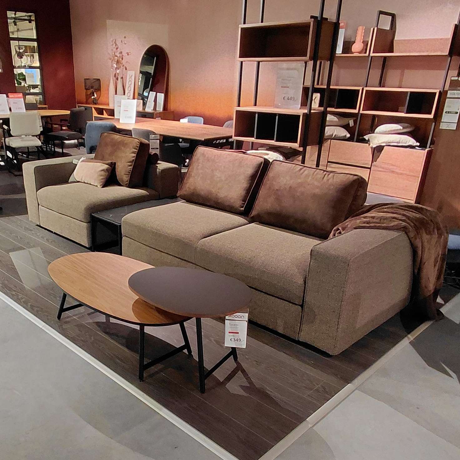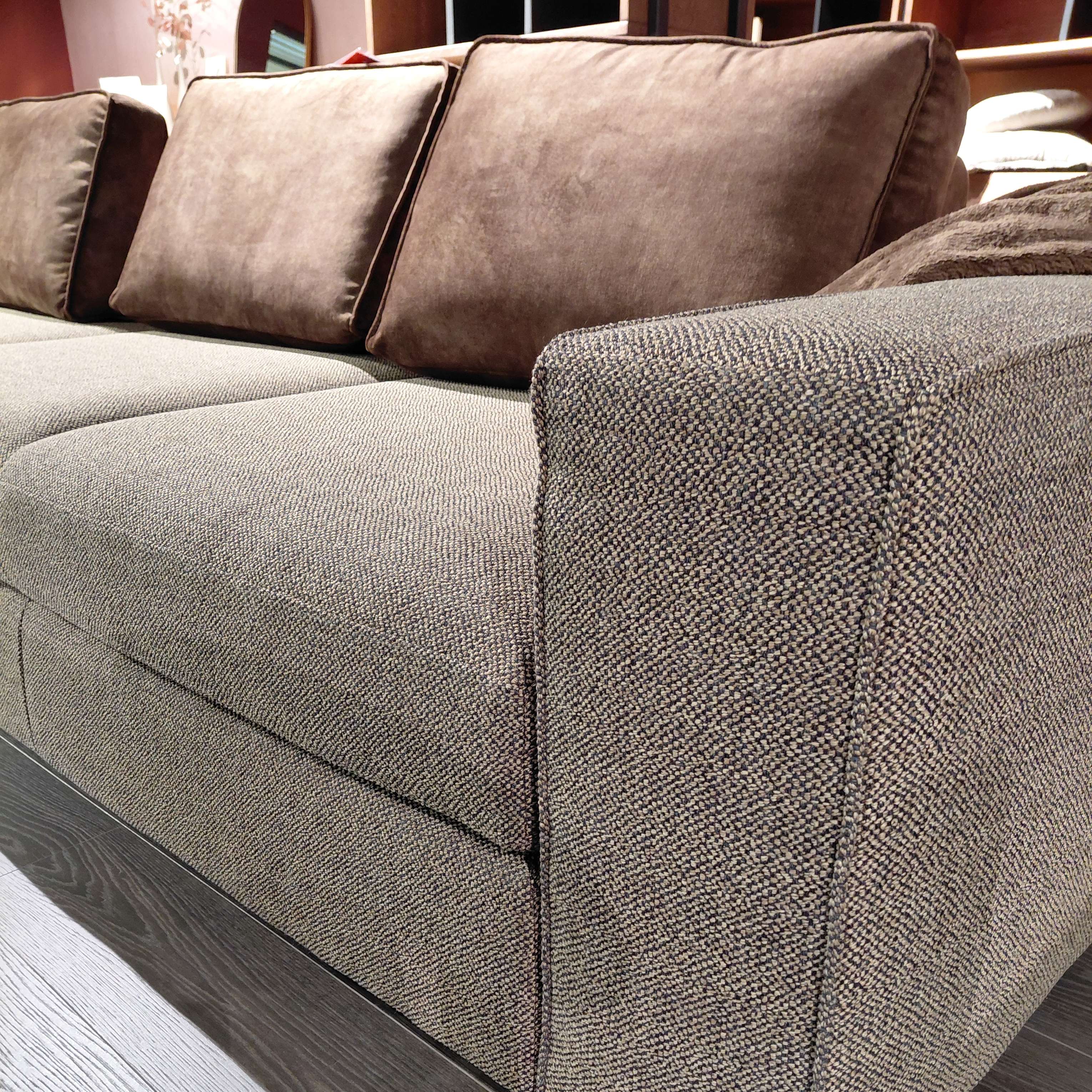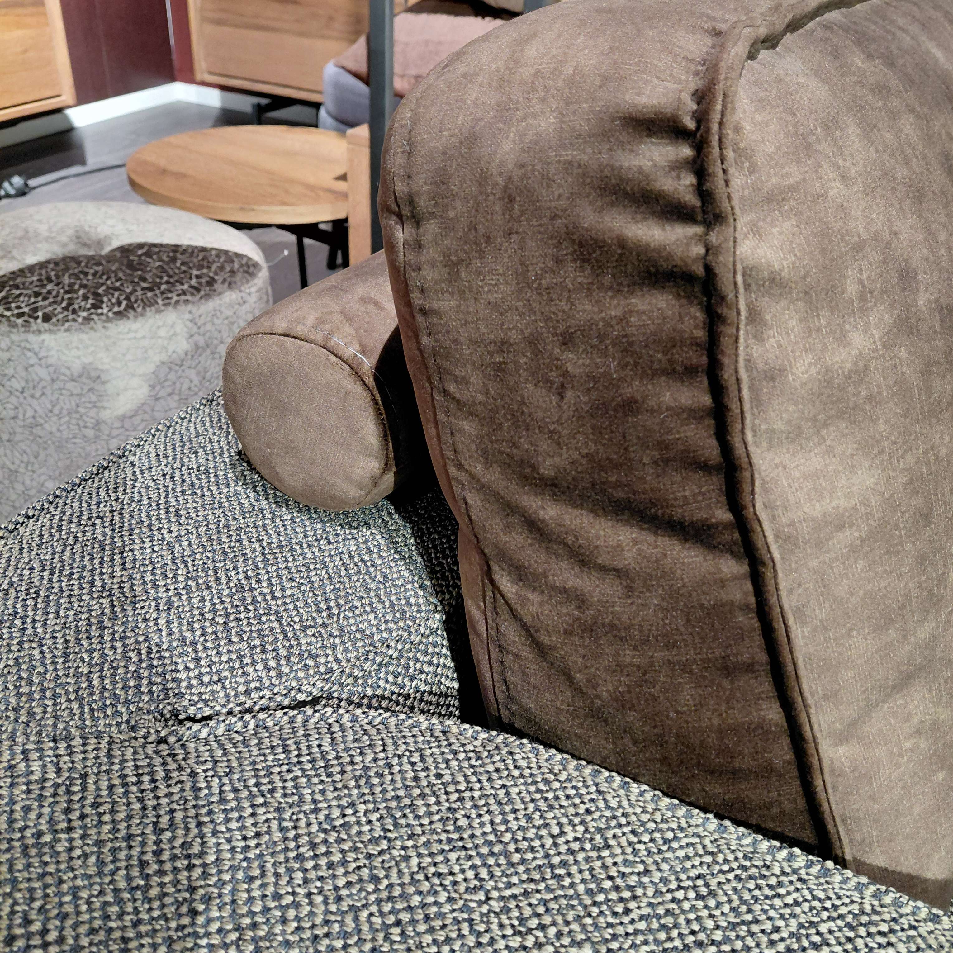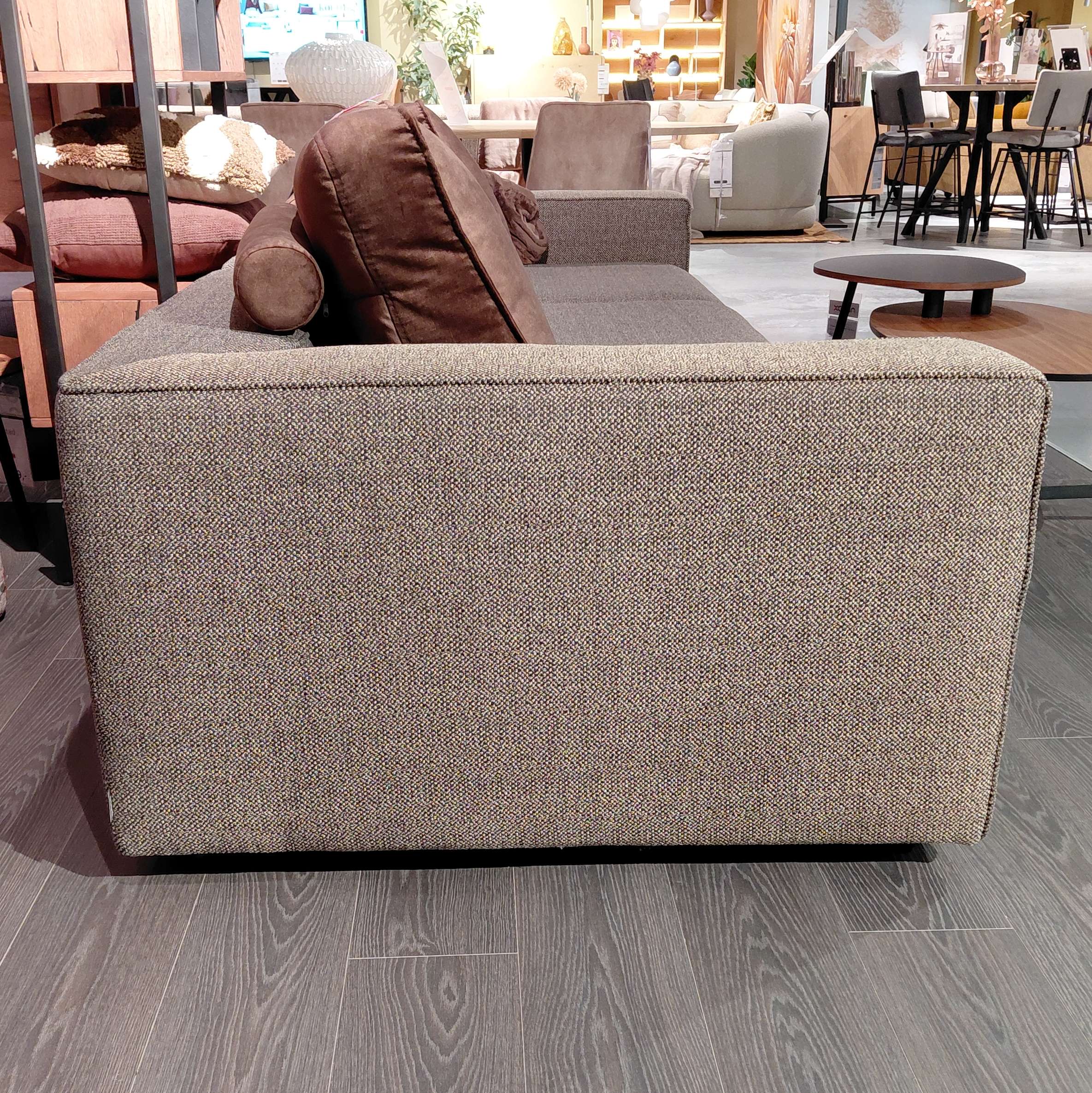Stof Toba kleur Tobacco, donkerbruin gemeleerd, rugkussens velour stof Karese kleur espresso (donkerbruin).