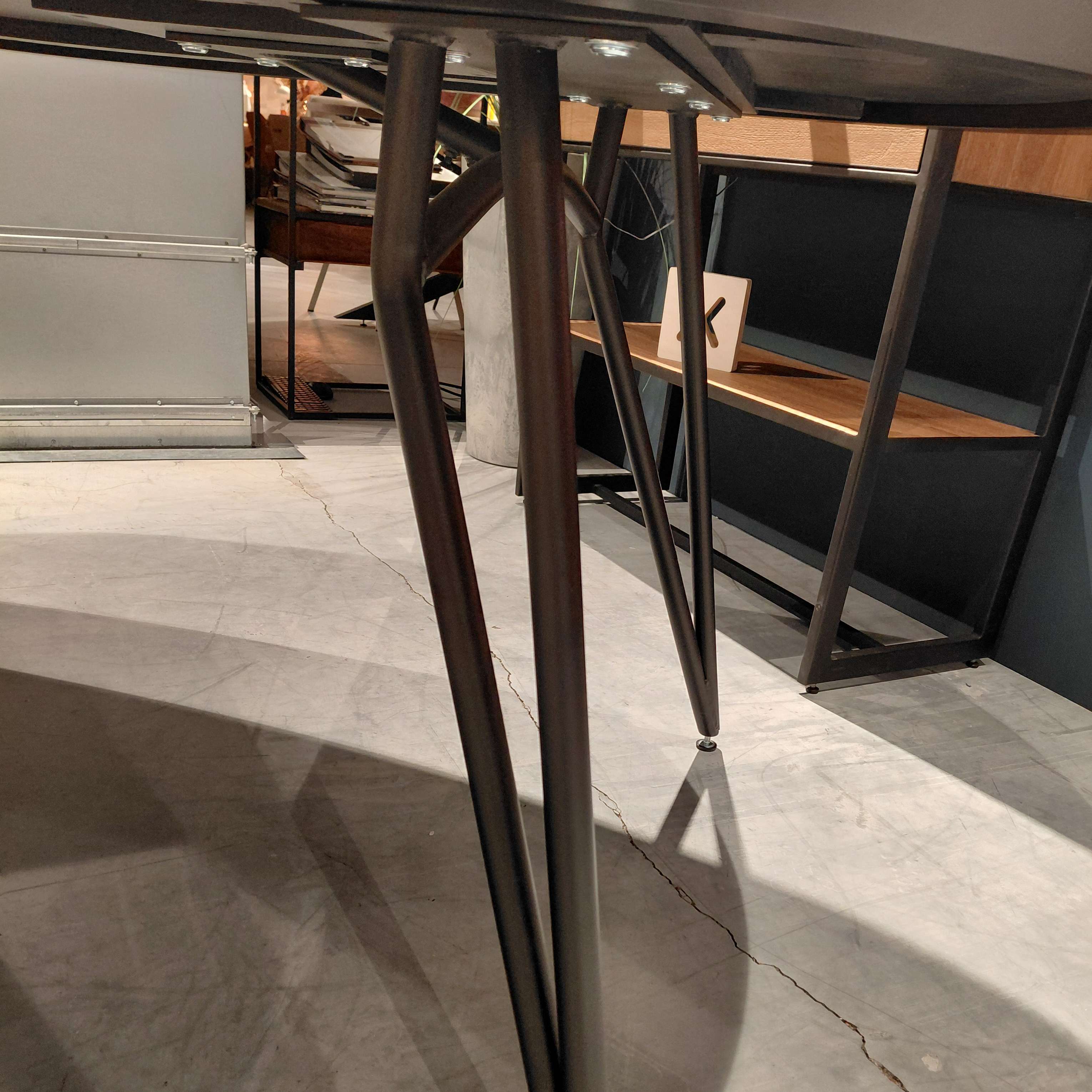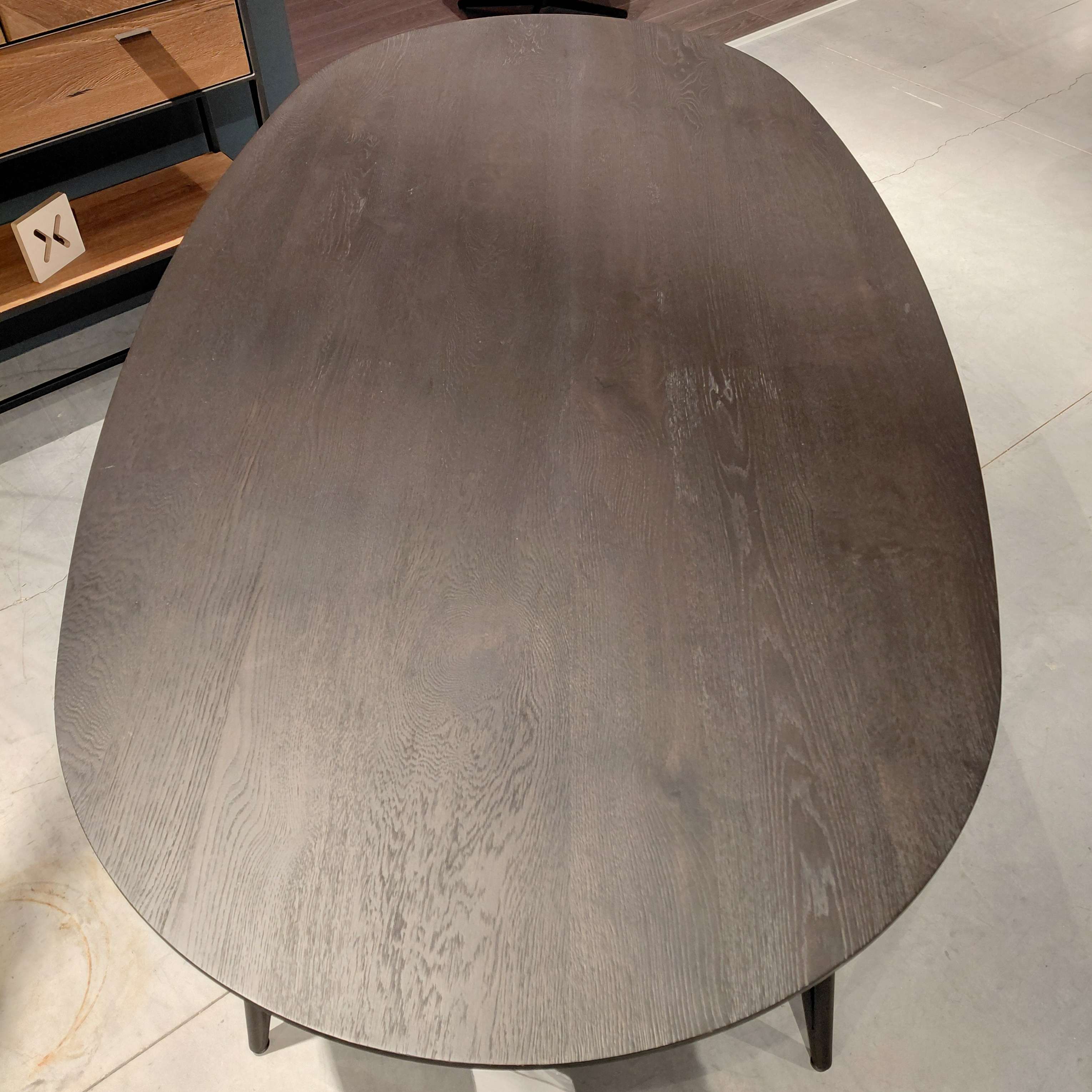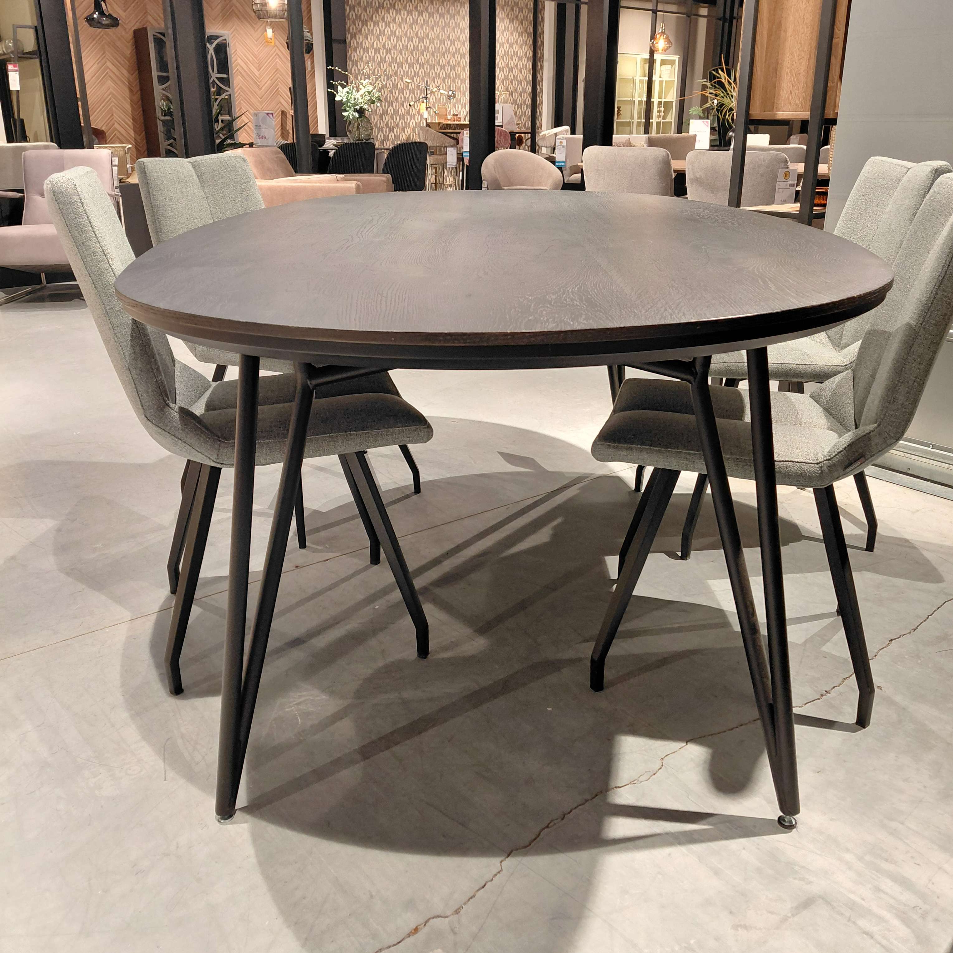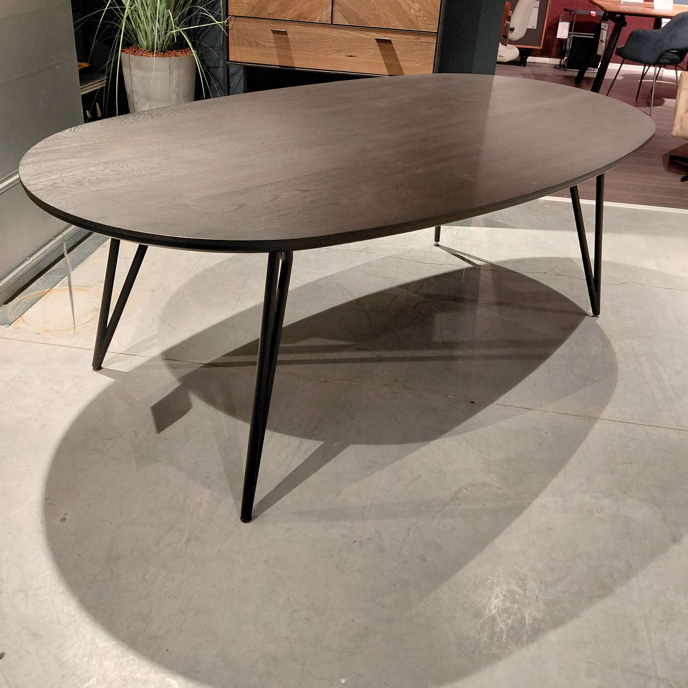 De tafel Vik van Xooon valt op door zijn mooie ronde zwartmetalen designpoot waar een prachtig eikenhouten tafelblad op ligt in de kleur onyx.